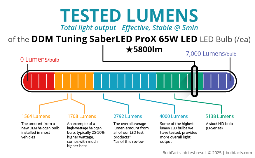 The DDM Saber ProX comes in strong with a measured 11,600 lumens per kit (5800 per bulb), representing a +276% increase over stock halogen headlights. This high lumen rating places it firmly in the performance category, especially when you consider that most mid-range LED kits top out around 4000–5000 lumens.